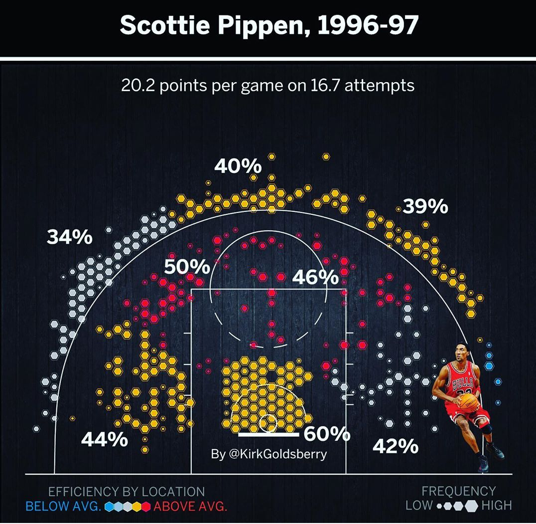 今天有美媒晒出了一张皮蓬96-97赛季的投篮热图,从图中可以看出皮蓬的投篮分布点遍及全场各个位置,在罚球线附近中距离位置命中率极高。皮蓬在96-97赛季场均能拿到20.2分6.5篮板5.7次助攻1.9次抢断0.6次盖帽,三项命中率分别为47.4%、36.8%、70.1%。他也在这个赛季入选了全明星,以及年度第二阵容和最佳防守一阵。现役哪位球员投篮分...也许您还喜欢:世界杯直播 亚洲杯直播 欧洲杯直播 足球直播