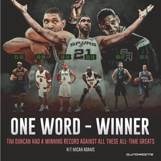 邓肯对阵詹姆斯战绩为21胜15负,胜率58.3%?