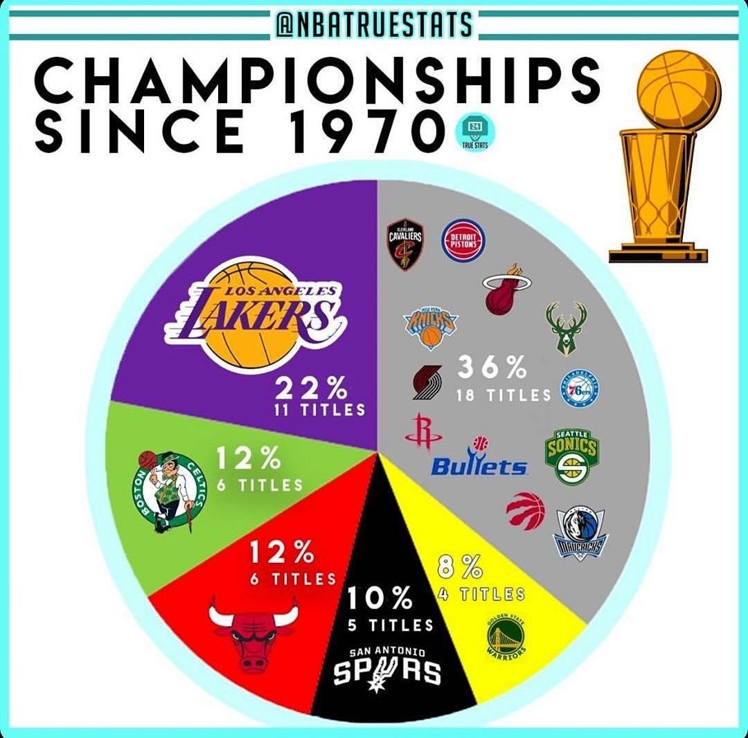 自打1970年以来,NBA冠军球队中湖人豪夺11座总冠军奖杯,占比22%绿凯拿到6 座总冠军奖杯,占比12%公牛也是6 座总冠军奖杯,占比12%狗刺拿到5 座总冠军奖杯,占比10%勇士夺得4 座总冠军奖杯,占比8%其余十一支球队共计拿到18个总冠军奖杯,占比36%【即使最近几年我湖比较低迷,但还是无法掩盖祖上有矿的豪横】