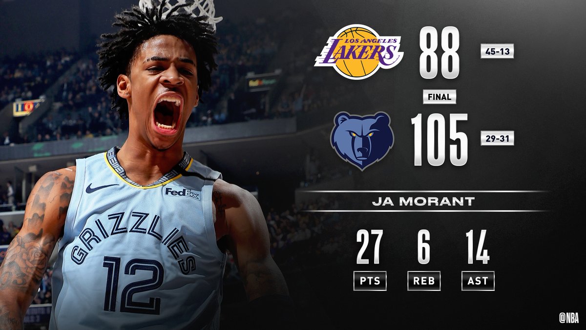 灰熊在主场战胜西部第一湖人,莫兰特得到了27分14助攻6篮板1抢断。