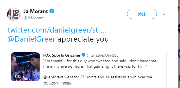 莫兰特转发他接受采访的推特@了那名球迷,写到:“@DanielGreer感谢你。”