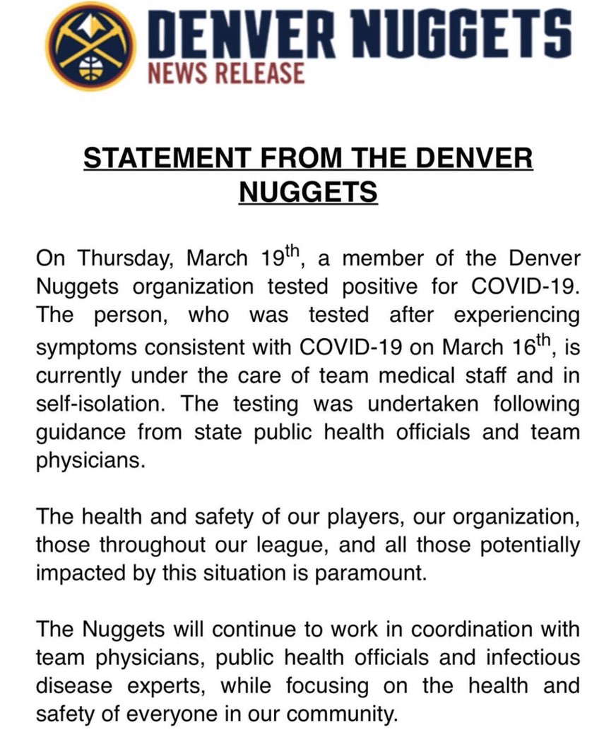 今天掘金队表示,球队的一位成员因为出现了症状而被进行病毒测试,最终确认感染。目前,该名成员已经在球队医生的检测和照顾之下开始进行自我隔离。