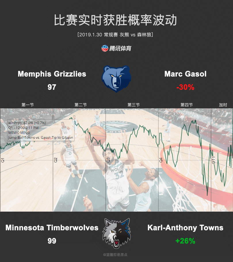 下图是这场比赛实时获胜概率波动,每一帧跨度大致为比赛里的一分钟,获胜概率根据比赛实时赔率计算而得,右侧的球员表示为球队获胜概率增加或降低最多的球员,也就是表现最好和最坑的球员。