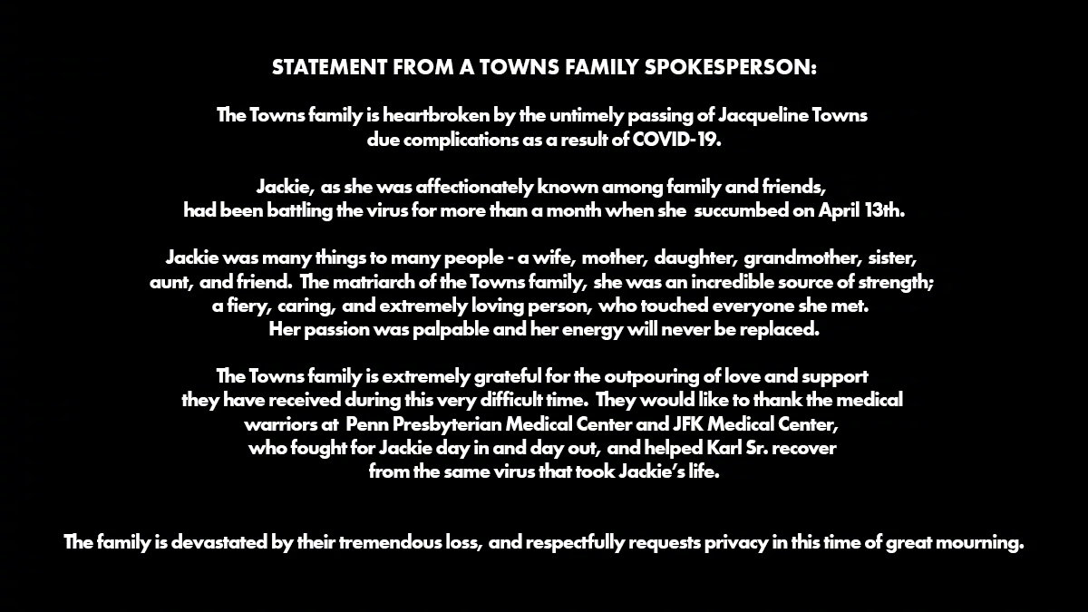 #唐斯母亲因新冠肺炎去世# 森林狼官方发布公告,唐斯的母亲Jacqueline Towns因感染新冠肺炎不幸去世,享年52岁!!![蜡烛][蜡烛][蜡烛] ???唐斯节哀吧,希望他能够坚强起来!!!??也许您还喜欢:世界杯直播 亚洲杯直播 欧洲杯直播 足球直播