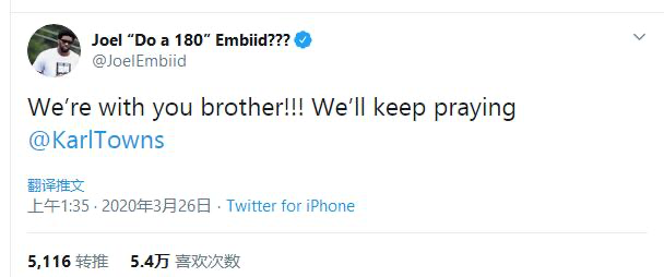 与唐斯素有恩怨的76人队中锋乔尔-恩比德通过推特为唐斯祈祷,他说到:兄弟,一定要坚强起来,我们与你同在,同时@唐斯的推特。