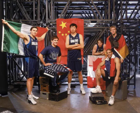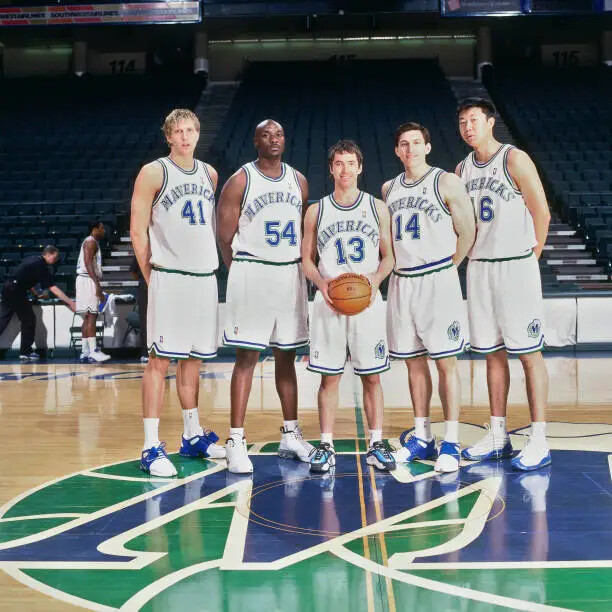 2000-01赛季的小牛是NBA历史上第一支拥有多名(3个以上)国际球员的球队。图一从左至右:诺维茨基、埃克奇、纳什、纳胡拉、王治郅, 分别来自德国,美国,加拿大,墨西哥,中国。值得一提的是,大郅在1999年被小牛选中但是直到2001年才登陆NBA,如果他能早去两年,或许发展会更好吧!