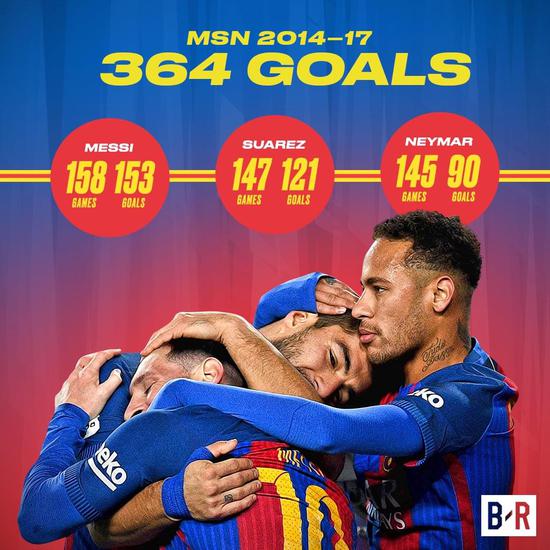 MSN是巴萨队史最强三叉戟组合,在内马尔离开巴萨后随之解体,但是在3人联手的3年里,一共共同出战110场,获胜84场,胜率高达76%;三人联袂出场8896分钟,打进364球,互相助攻124次;其中梅西158球153助攻,苏亚雷斯147球121助攻,内马尔145球90助攻。
