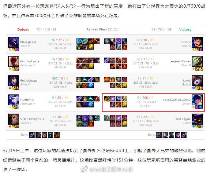 这位国外的玩家为了刷新记录,一整场都在送,最终,在这场耗时151分钟的rank中,他居然送了700次。可是就是在这样的背景下,他的队友居然没有放弃比赛,一直在兢兢业业的玩,没想到四打五,居然还赢了!这样的队友真是爱了爱了也许您还喜欢:世界杯直播 亚洲杯直播 欧洲杯直播 足球直播