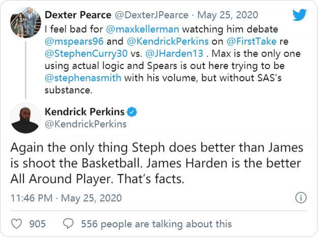 帕金斯在昨日的节目《First Take》中声称哈登是比库里更好的全能球员,激起了网友的批判。网友Dexter就表示:“我真的很可怜Max Kellerman,看着他和Marcus Spears以及帕金斯辩论库里哈登。Max是唯一一个有逻辑的人,Marcus则模仿着斯蒂芬-A-史密斯的腔调,但他却没有史密斯的干货。”而帕金斯则回应Dexter说:“再说一次,库里唯一比哈登...也许您还喜欢:世界杯直播 亚洲杯直播 欧洲杯直播 足球直播