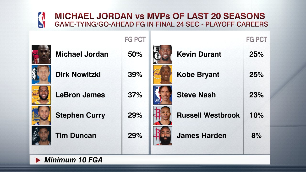 根据ESPN Stats & Info的统计,迈克尔-乔丹职业生涯季后赛关键球命中率比过去20年所得过MVP的球员在季后赛中的关键球命中率都高。