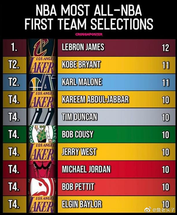 NBA一阵次数排行榜,詹姆斯12次独占鳌头排第一,科比11次排第二!