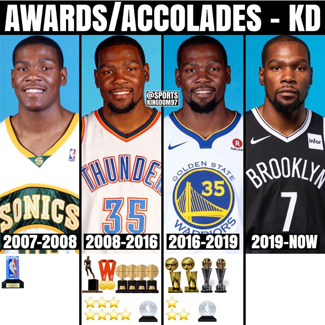 美国自媒体Sports Kingdom盘点了杜兰特职业生涯每个阶段取得的荣誉,包括四个时期:超音速,雷霆,勇士,篮网。