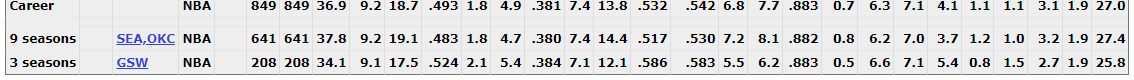 2008-16赛季阿杜在雷霆,这期间他4度荣获得分王,一次加冕MVP,跟随美国队拿到了两枚奥运金牌,进了7回全明星,拿了一个全明星MVP。