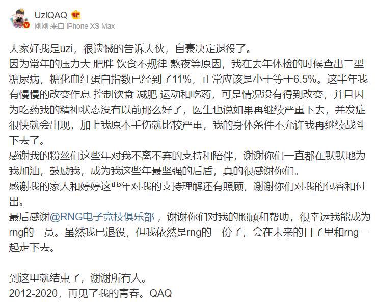 刚刚Uzi在微博上发文:宣布正式退役大家对他有什么话想说的?