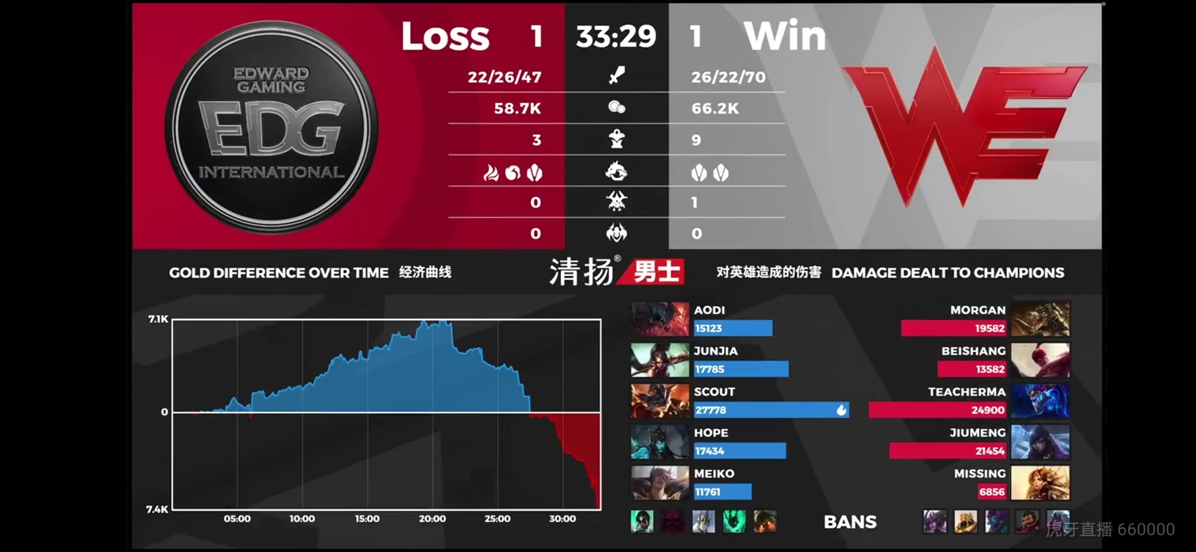 hope这把依旧拿到了卡莉斯塔,但是前期人头主要集中在豹女和兰博身上,edg前期领先近5千经济,无奈马老师利用龙王在大龙处肉身开团,厄斐琉斯团战爆炸输出,we连续三波团战获胜,翻盘成功!这支新we很有韧性啊!也许您还喜欢:世界杯直播 亚洲杯直播 欧洲杯直播 足球直播