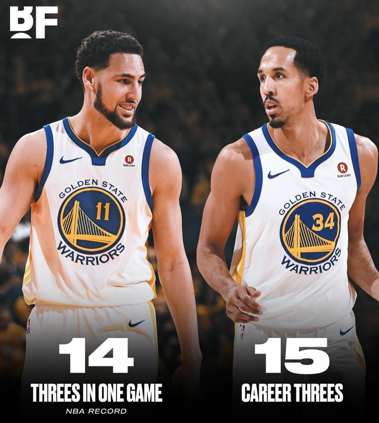 他勇士时期的队友克莱-汤普森曾有过单场比赛命中14记三分的壮举,创造了NBA历史新纪录。在与公牛的比赛中,克莱上场27分钟,29投18中,三分24中14,砍下52分5篮板1抢断。