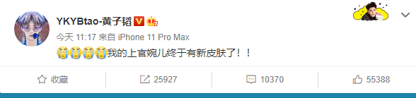 什么情况?婉儿新皮一出 黄子韬发博举爪欢呼