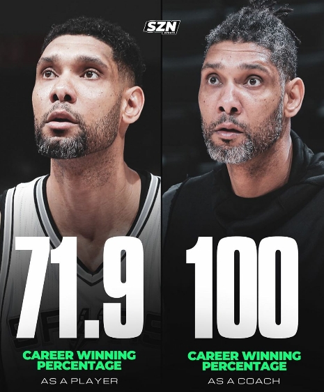 左边是邓肯球员生涯赢球率71.9%右边是邓肯当主教练百分之百赢球率100%