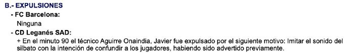 裁判报告中写到,莱加内斯主教练阿吉雷被红牌罚下是因为他一直都在吹口哨冒充裁判都哨声影响比赛,多次警告不听话,然后被罚下。让我想起门将平托(退役后好像去做歌手了)