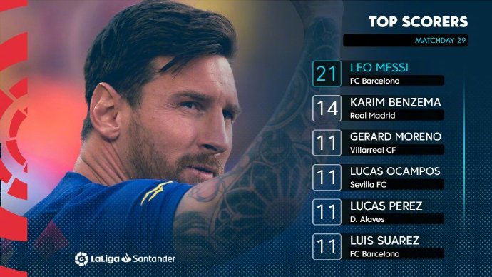 西甲射手榜梅西打进21球遥遥领先,同时助攻14次是欧洲五大联赛制造进球最多的球员