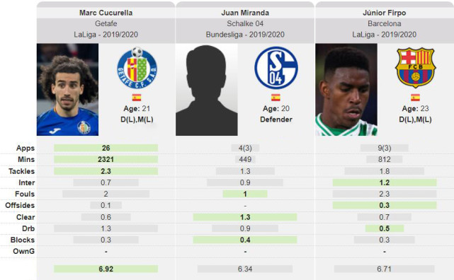 看到的未必是完全的,我们可以通过数据来佐证一下,我比较了一下米兰达和另两位踢左后卫和左边卫的巴萨队员库库雷利亚和菲尔波的防守数据,三人中只有库库雷利亚是绝对主力,但只有库库雷利亚抢断数据占优,考虑到他踢左边卫比较多这是正常且合理的数据。菲尔波在拦截、被过和越位方面占优,越位多是他参与进攻多的体现,而拦截和被过少是他防守相对强的体现。