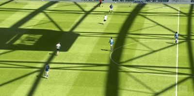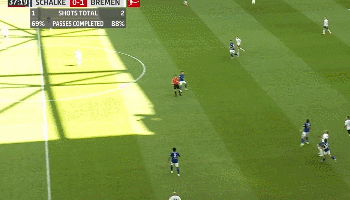 作为一个边后卫进攻时插上去打助攻是非常常见的,当然部分边后卫习惯持球内切。米兰达属于前者是一个比较传统的边后卫,很少往内切。加上在拉玛西亚青训了5年,进攻大多是团队配合型进攻,下图是2019/20赛季德甲沙尔克04VS云达不莱梅,米兰达接到托迪博传球再传给队友,随后无球套上接直塞后传中,可惜最后没传到队友头球。
