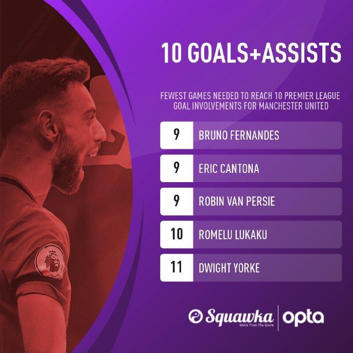 在曼联历史上达成制造进球10+的球员中,费尔南德斯所用场次9场追平了坎通纳和范佩西的曼联队史最快纪录!