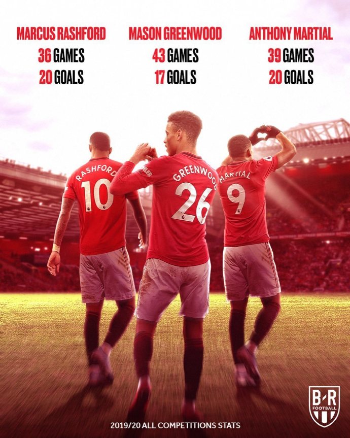 格林伍德、拉什福德和马夏尔本赛季各赛事共打入57球,超过了利物浦三叉戟的51球!
