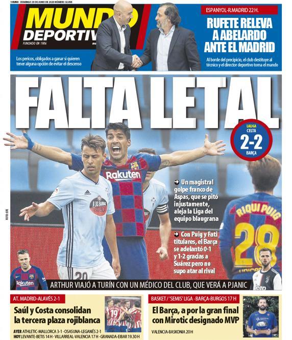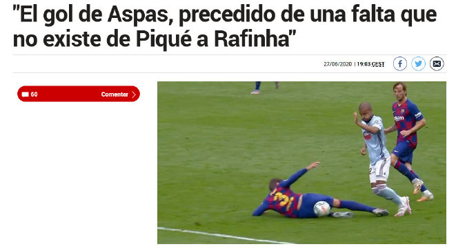 《马卡》:阿斯帕斯扳平的任意球,裁判专家安杜哈尔认为皮克没有对拉菲尼亚犯规。(没铲到人,不过阿斯帕斯的任意球是无解的,低平球绕过人墙**角,特尔施特根无能为力)