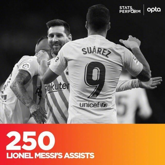 梅西踢满全场助攻梅开二度,得到全场最高的赛后评分8.9分,巴萨生涯助攻250次,其中179次在西甲。本赛季西甲有5场助攻梅开二度,总数达17次。同时2020年助攻数超越穆勒来到11次居五大联赛之首。