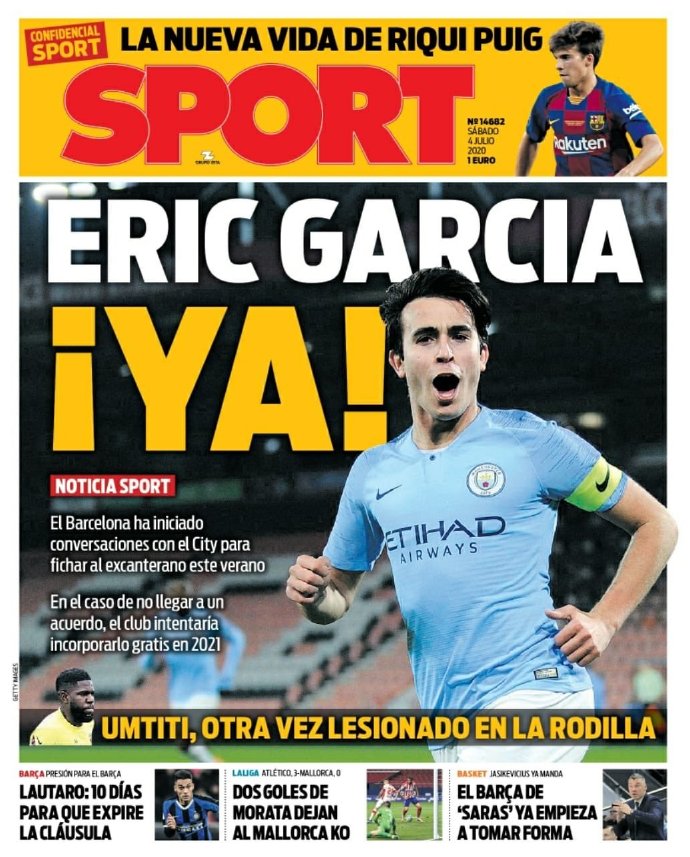 《每体》:追击!埃里克-加西亚!!!巴萨已经告知曼城想带回中后卫埃里克-加西亚,球员合约2021年到期,暂时还未和曼城续约,如果球员想回来,而巴萨今年夏天如果尝试不成功,明夏可免签。