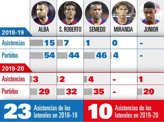 《世体》:相比上赛季,本赛季巴萨边后卫的助攻次数明显下滑了。