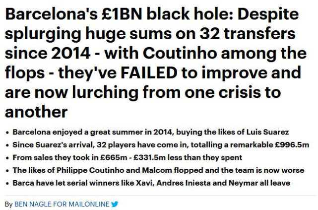 2017年是巴萨混乱的开始,此前3年引援虽然没有绝对意义上帮助巴萨连拿欧冠和西甲,但经济层面上完全不亏。但根据《每体》:2.22亿离开(2017),花了3.45亿+8000万欧元浮动条款也没有弥补空缺。魔咒仍在继续。