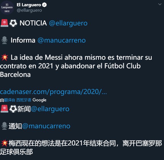 西班牙媒体塞尔电台透露,梅西目前已经搁置和巴萨续约的事宜,他想在2021年合同到期之后离开巴萨。此前西班牙媒体广泛报道,梅西将和巴萨续约3年,年薪维持在税后4000万,但他改变想法了。