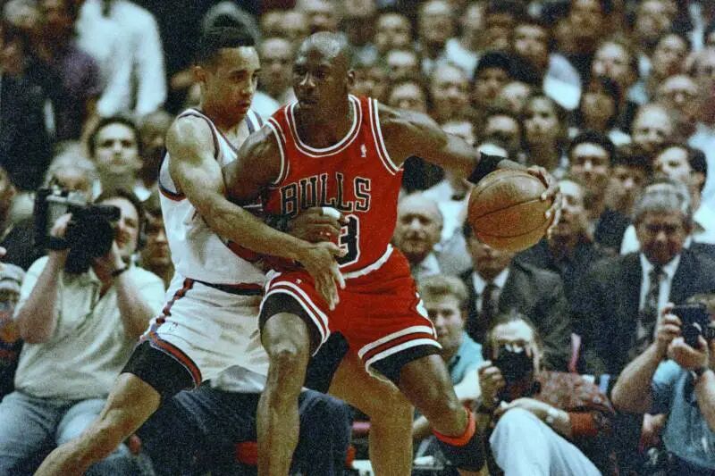 一边倒的竞争存在么?在这种情况下,他的确是。在五次对阵尼克斯的季后赛当中,每次都是以尼克斯败北为结局。在麦迪逊花园广场,乔丹享受着他自己伟大,并且令人瞩目的个人表现。