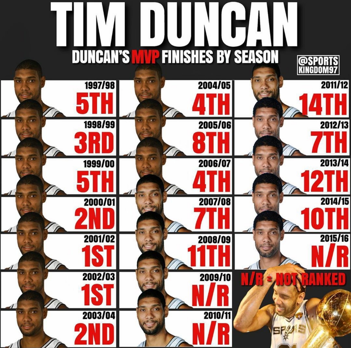有媒体近日统计了马刺名宿邓肯生涯历年MVP投票排名,生涯19个赛季,有12个赛季在前十,前8个赛季更是均在前五位,这统治力真是强!1997-98赛季排第5,乔丹当选MVP;1998-99赛季排第3,卡尔-马龙当选MVP;1999-00赛季排第5,奥尼尔当选MVP;2000-01赛季排第2,艾弗森当选MVP;2001-02赛季排第1;2002-03赛季排第1;2003-04赛季排第2,加内特...也许您还喜欢:世界杯直播 亚洲杯直播 欧洲杯直播 足球直播