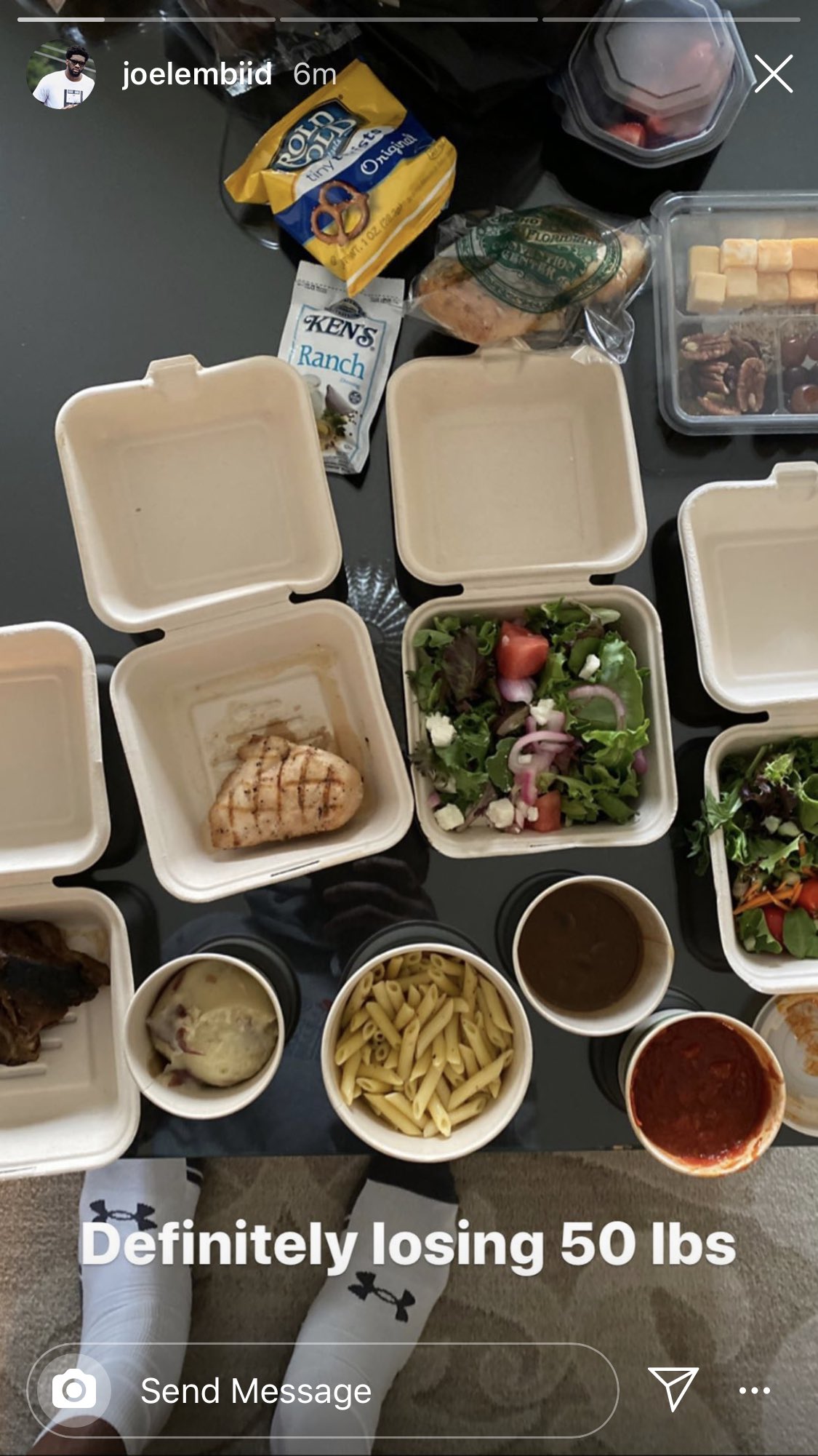 76人球员顺利到达复赛地之后,恩比德在INS上晒出了他们的晚餐。