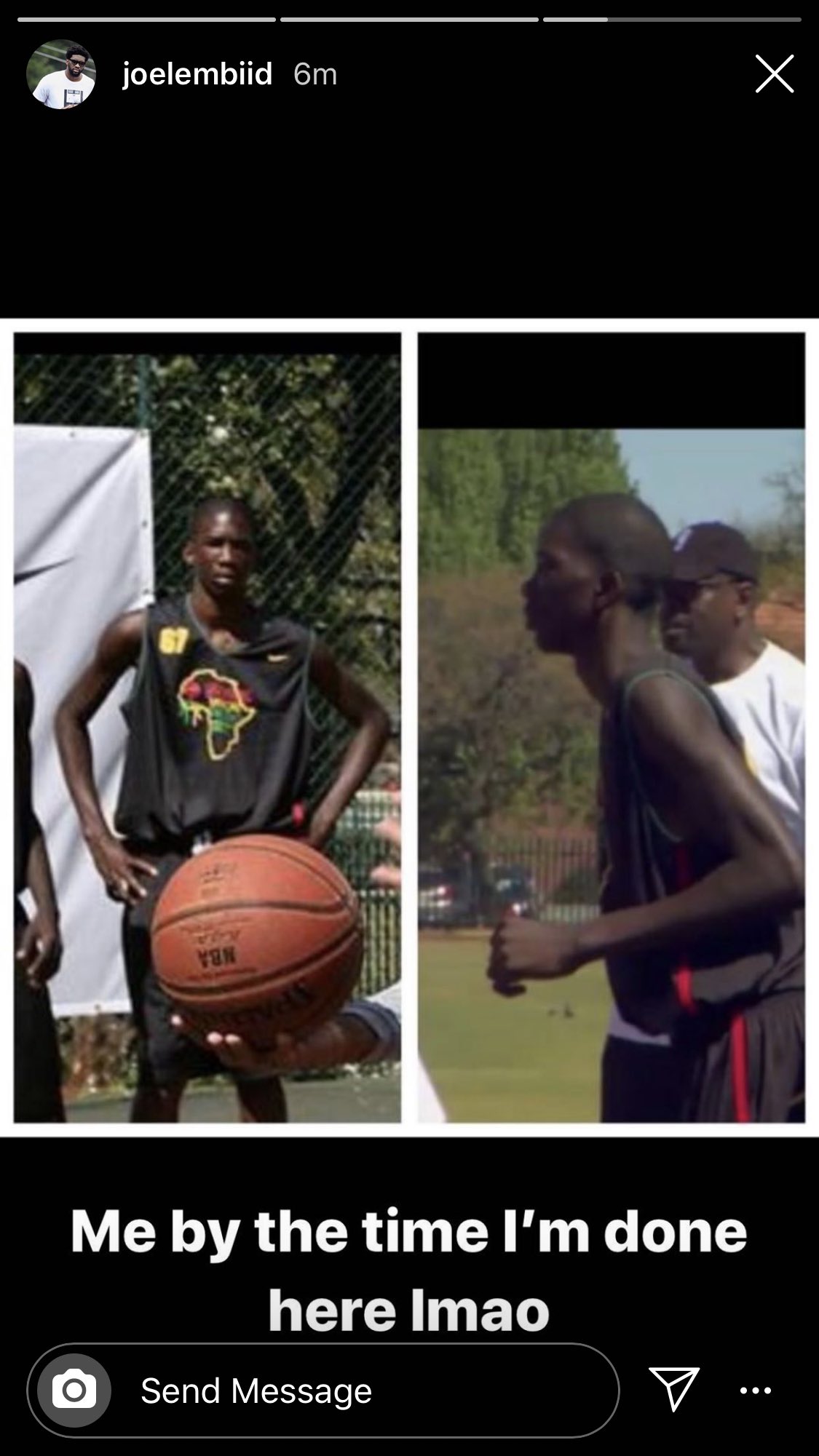 恩比德晒出了他以前骨瘦如柴的时候的照片,配文:“等我在这儿的时间结束时就成这样了。”