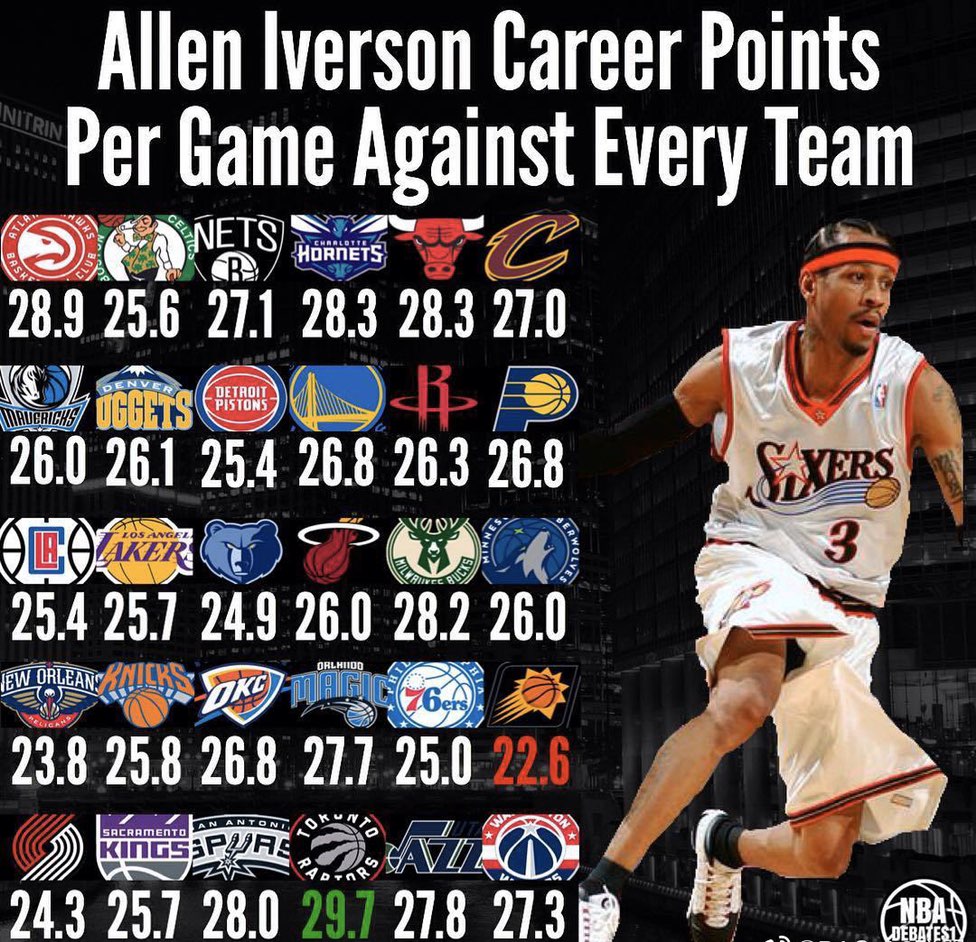 伟大的阿伦·艾弗森对阵每一支球队的场均得分一览,对阵猛龙队最高29.7分,对阵太阳最低22.6分。也许您还喜欢:世界杯直播 亚洲杯直播 欧洲杯直播 足球直播