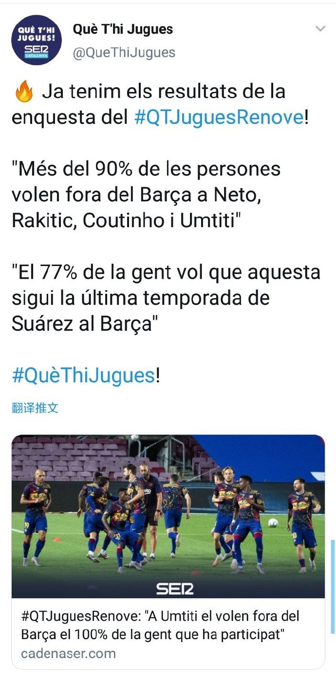 塞尔电台对加泰当地巴萨球迷民意调查,希望以下球员离开巴萨的占比。