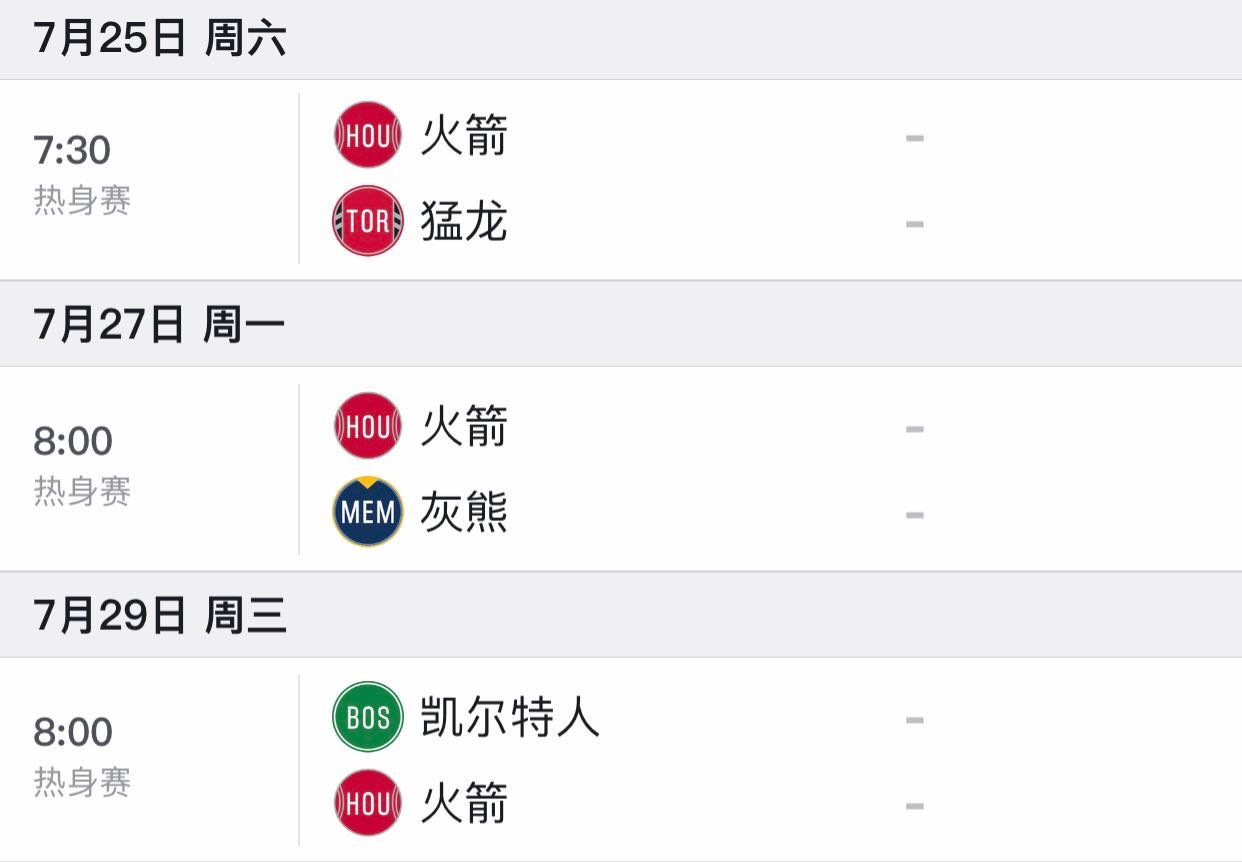 火箭三场热身赛周六正式开打,对手分别是猛龙、灰熊和绿军,各位火蜜们期待吗???\n希望火箭能够三战全胜