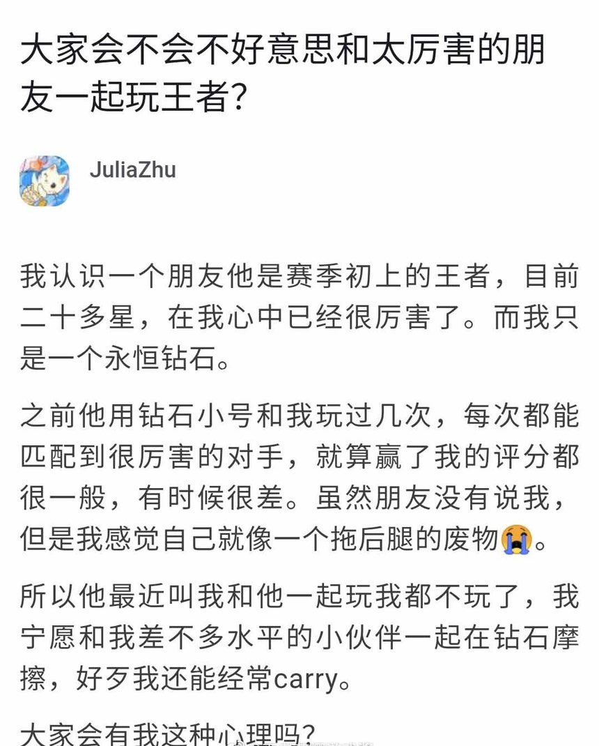 大家会不会不好意思和太厉害的朋友一起玩王者?