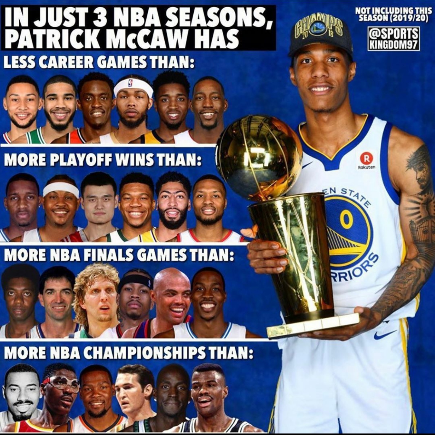 麦考在2016年第38顺位被勇士选中,新秀赛季便跟随勇士成功夺冠,第二个赛季轻松达成两连冠。2018-19赛季麦考先是加盟了骑士,随后中期又加盟了猛龙,猛龙一路杀入总决赛并击败麦考的老东家勇士夺冠。很多球迷称赞麦考是移动的王朝!
