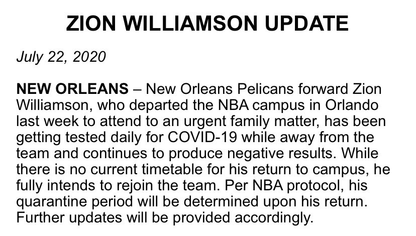 鹈鹕官方报道,此前因家庭原因暂时离队的锡安-威廉姆森最近每天都会接受新冠检测,目前所有的结果都是阴性。