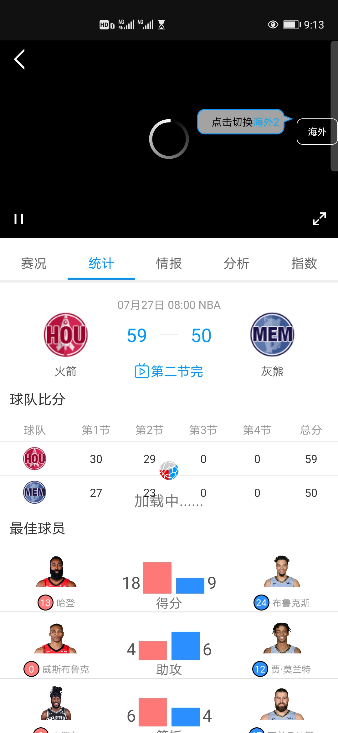 半场比赛结束 火箭??小小的领先9分 继续加油 拿下下半场也许您还喜欢:世界杯直播 亚洲杯直播 欧洲杯直播 足球直播