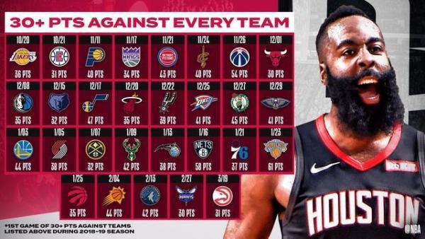 哈登面对全联盟各球队砍下的30+表现,得分能力征服NBA