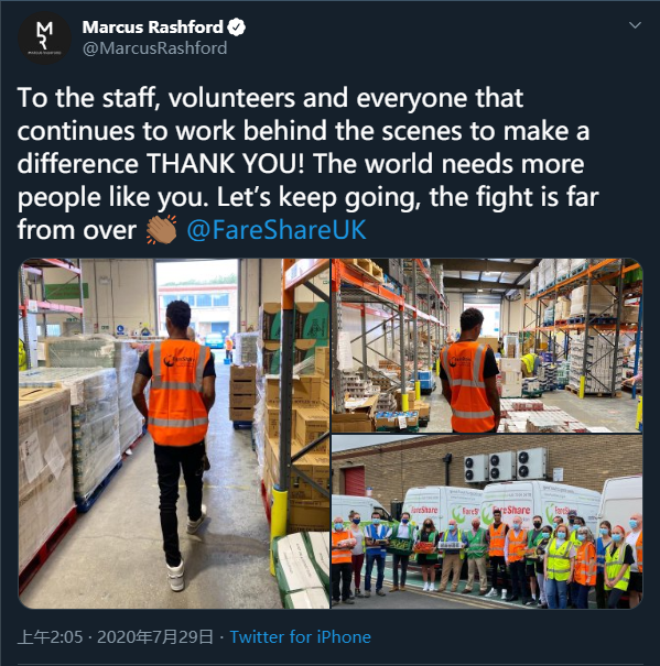 曼联前锋拉什福德在休赛期期间来到当地食品加工厂,为贫困的儿童提供食物,给有需要的人提供饭菜。同时还筹集了2000英镑用于救助贫困儿童,并在社交平台上感谢了所以的工作人员和志愿者。