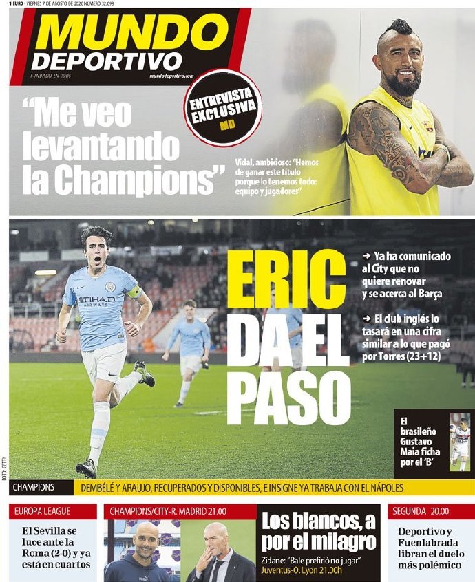 《世体》头条:比达尔:我看到我们将举起欧冠奖杯。我们必须赢得冠军,因为我们拥有赢下的一切:球队和球员。《世体》封面:埃里克·加西亚迈出一步。