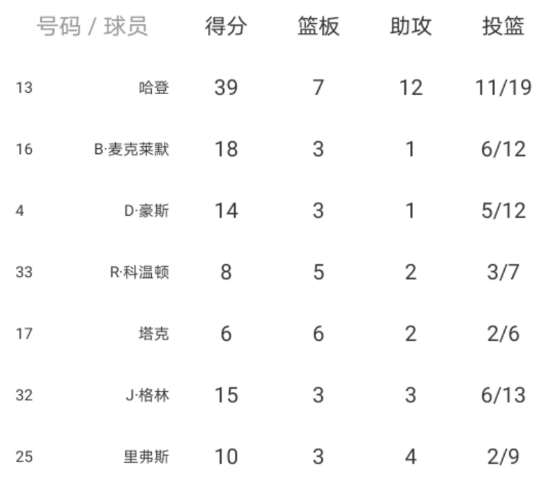 哈登39分8篮板12助攻,格林15分,迈克勒莫18分,塔克14分。?