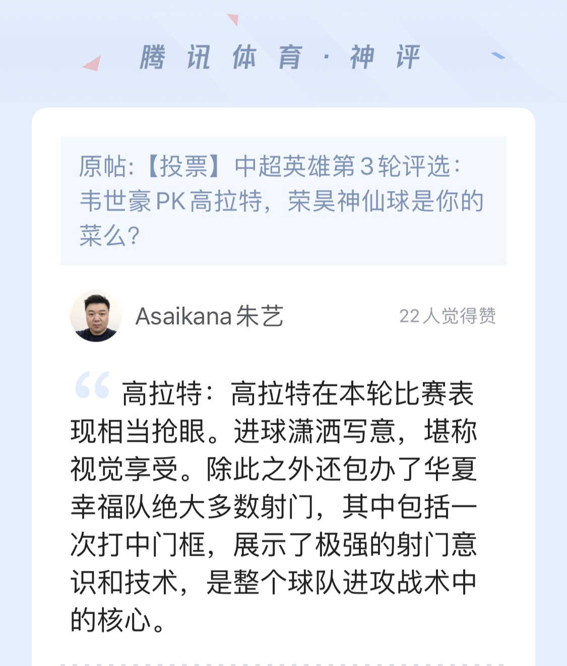 数据专家朱艺老师,和腾讯体育编辑部一样把票投给了700多天后王者归来的高拉特。上一次进球还是持巴西护照的外籍球员,今天已经是本土射手。高拉特写意的破门,证明了自己还是那个中场核心般存在的高圆圆。